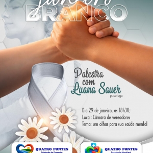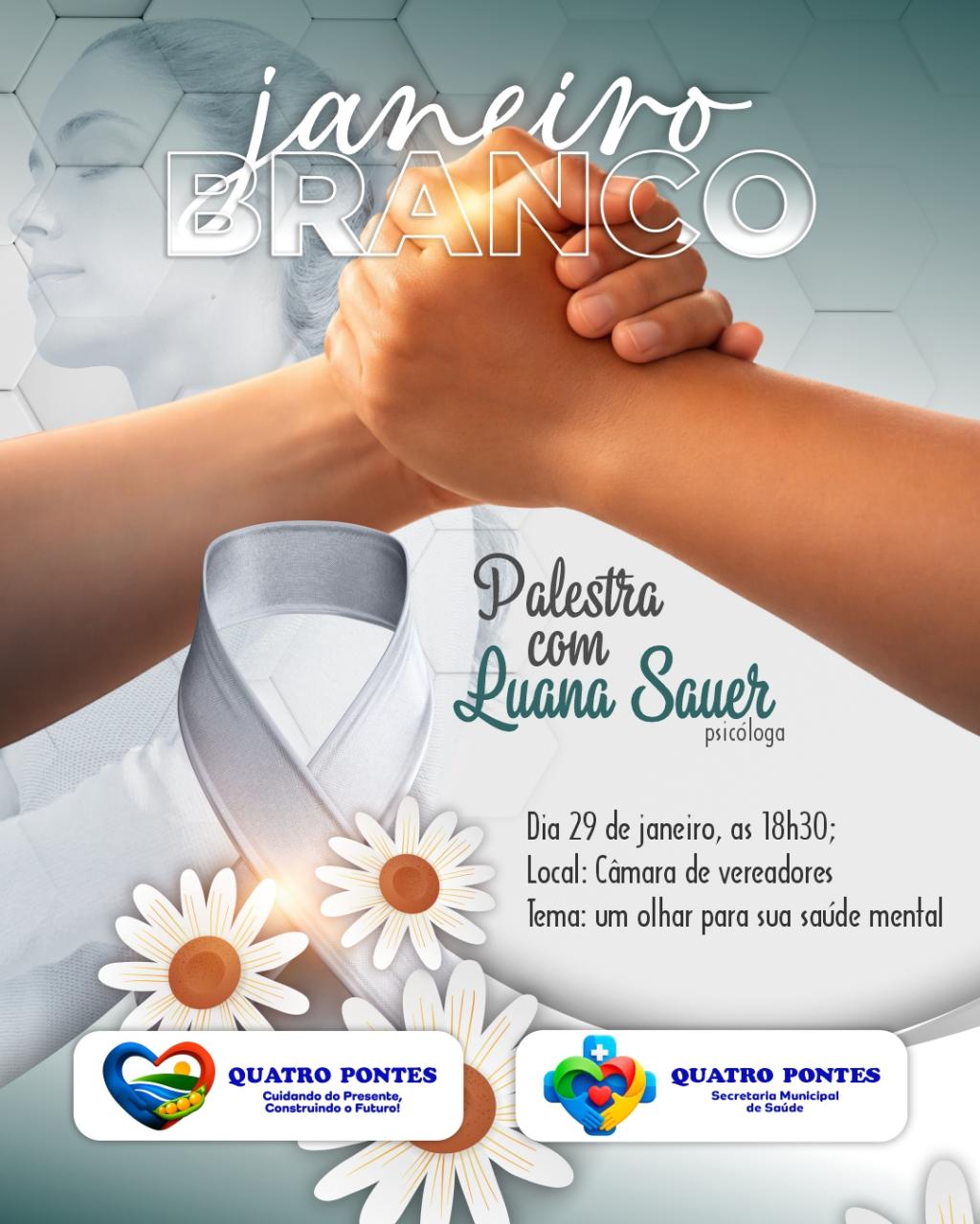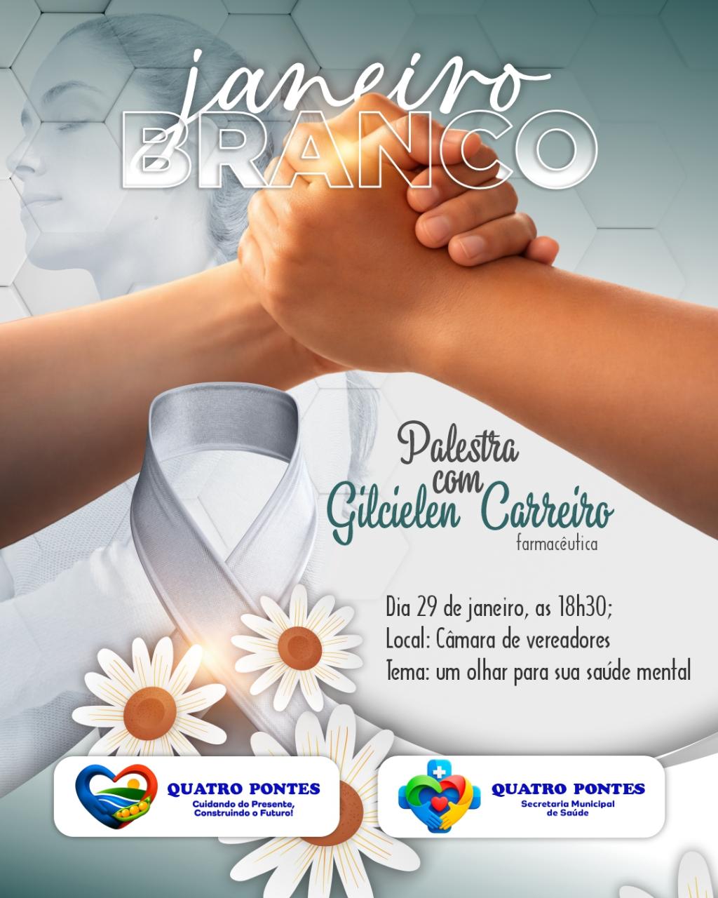 Quatro Pontes, 22 de janeiro de 2026 – A Prefeitura de Quatro Pontes, por meio da Secretaria Municipal de Saúde, realiza duas palestras em alusão à campanha Janeiro Branco, iniciativa nacional dedicada à promoção da saúde mental e emocional, com foco na conscientização, prevenção e orientação da população.