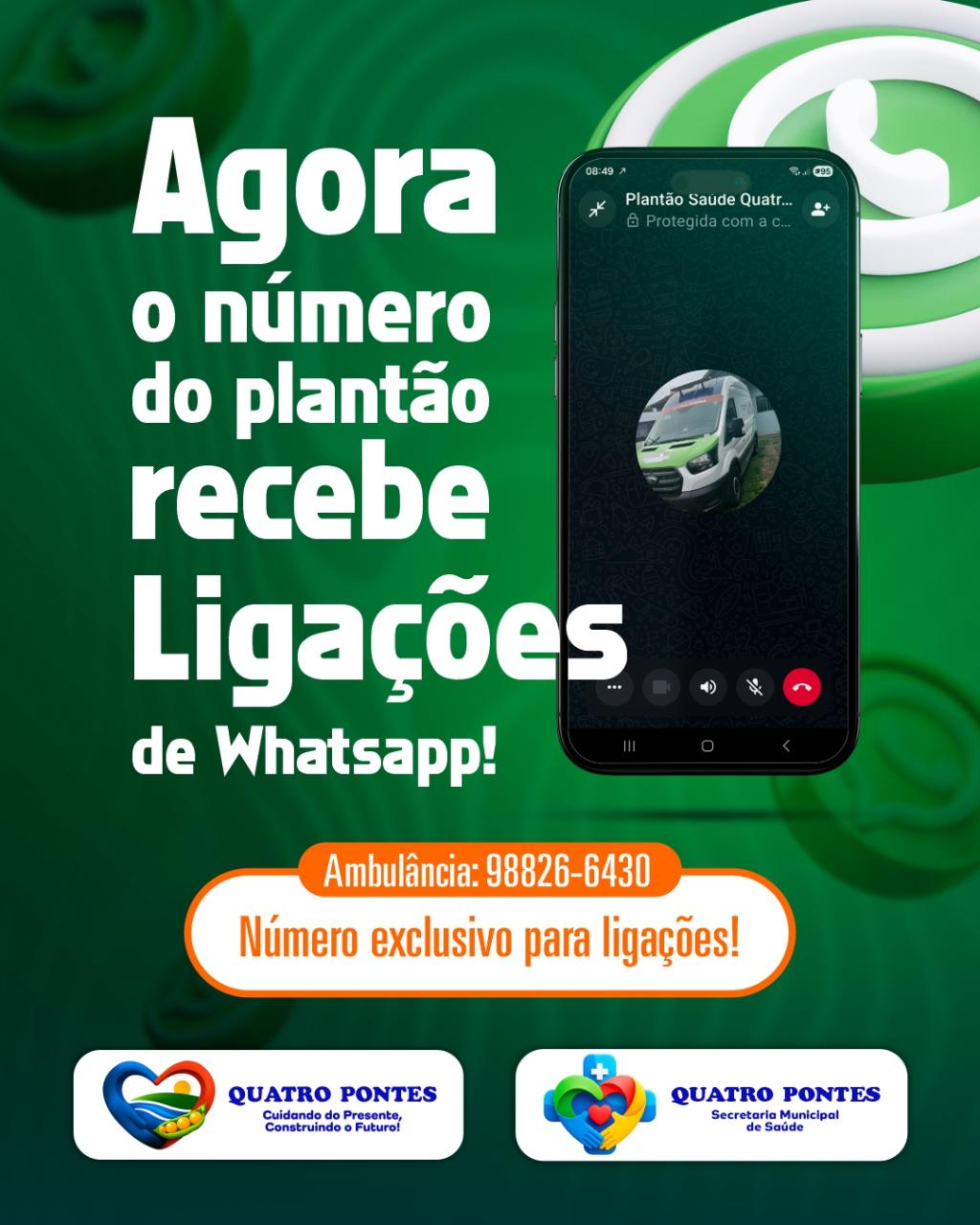Quatro Pontes, 23 de janeiro de 2026 – A Prefeitura de Quatro Pontes, por meio da Secretaria Municipal de Saúde, informa à população que os telefones de acionamento da ambulância e do plantão de saúde passam a receber ligações via WhatsApp, como forma de ampliar o acesso ao serviço, especialmente em regiões onde o sinal de telefonia convencional é instável ou inexistente.