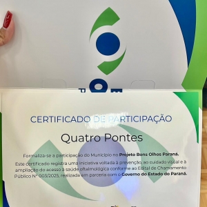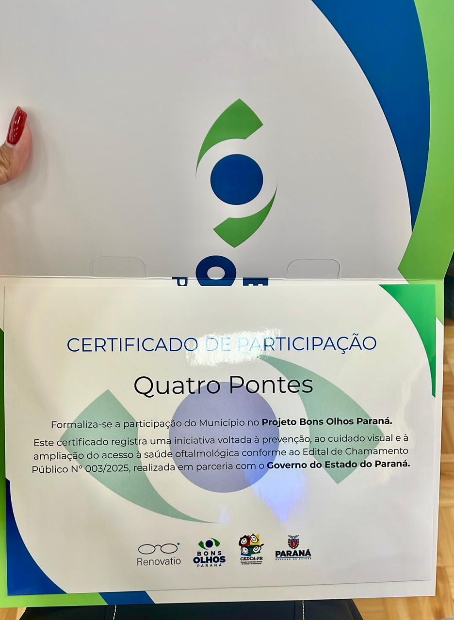Quatro Pontes, 25 de fevereiro de 2026 – A Secretaria Municipal de Desenvolvimento Social de Quatro Pontes formalizou a adesão do município ao Programa Bons Olhos Paraná, iniciativa do Governo do Estado, coordenada pela Secretaria de Estado do Desenvolvimento Social e Família (SEDEF), voltada à promoção da saúde ocular de crianças e adolescentes da rede pública de ensino.
