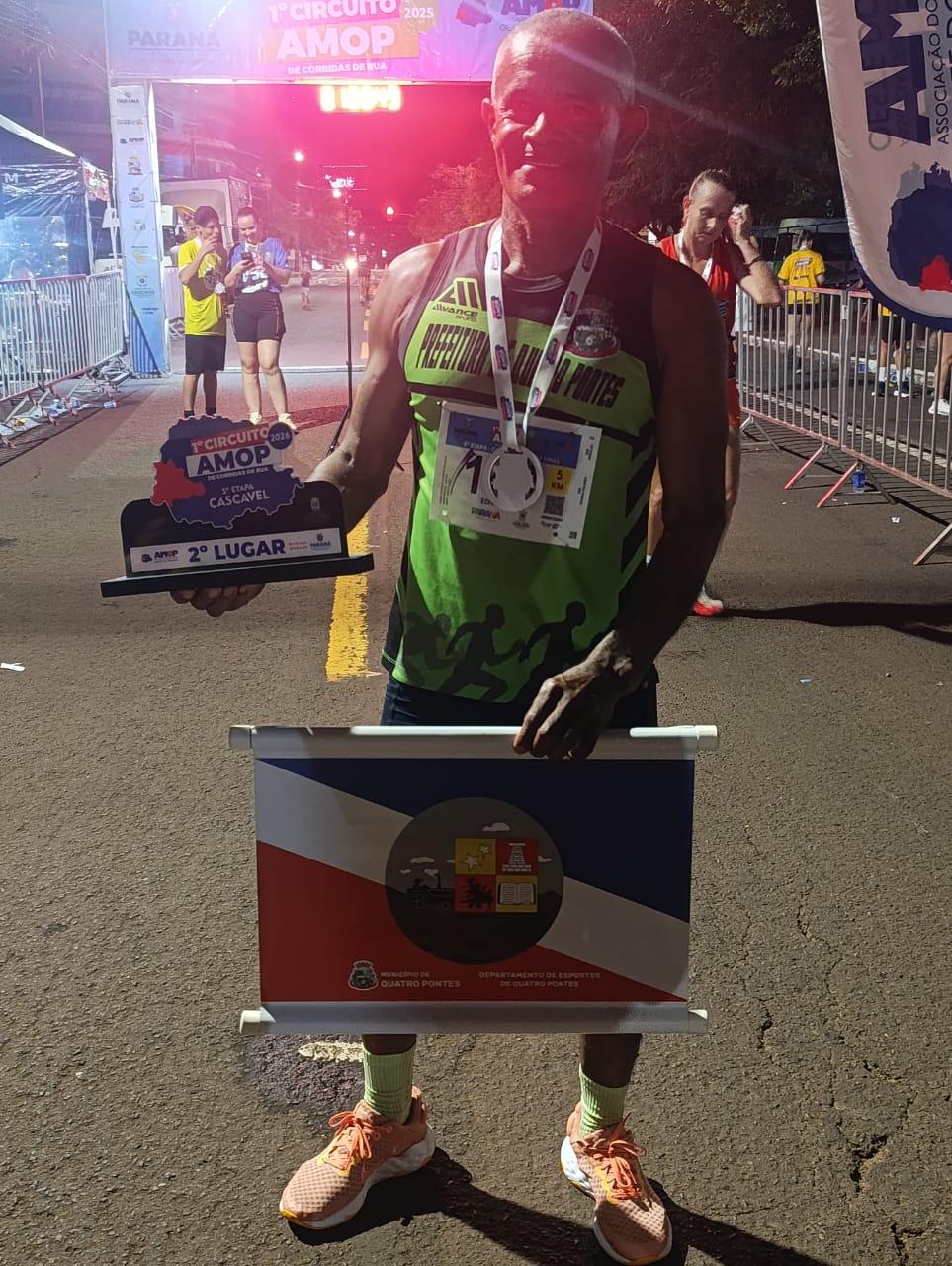O atleta Edivaldo Quintino da Silva, conhecido como “Corinthiano”, conquistou o 2º lugar na categoria de 55 a 59 anos, com apoio da Lei Municipal nº 3031 – Quatro Pontes Mais Esporte.