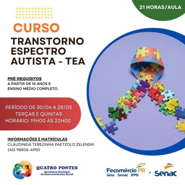 Dando continuidade às ações do Abril Azul, a Secretaria Municipal de Desenvolvimento Social promoverá um curso sobre o Transtorno do Espectro Autista, com foco na capacitação da comunidade. A formação será realizada no período de 30 de abril a 28 de maio, com aulas às terças e quintas-feiras, das 19h às 22h, totalizando 21 horas.