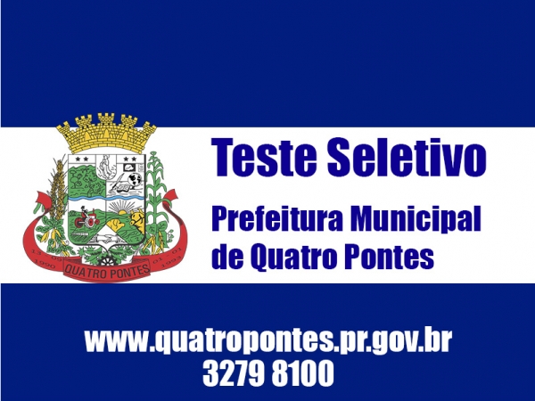 As inscrições serão realizadas na Prefeitura Municipal de Quatro Pontes, de maneira gratuita, via protocolo. A prova está prevista para o dia 20 de março.