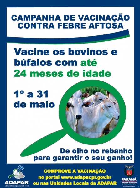 De 1º a 31 de maio acontece em todo o Estado do Paraná a campanha de Vacinação Contra a Febre Aftosa. Bovinos e Búfalos com até 24 meses de idade devem receber a vacina, inclusive os bezerros recém-nascidos.