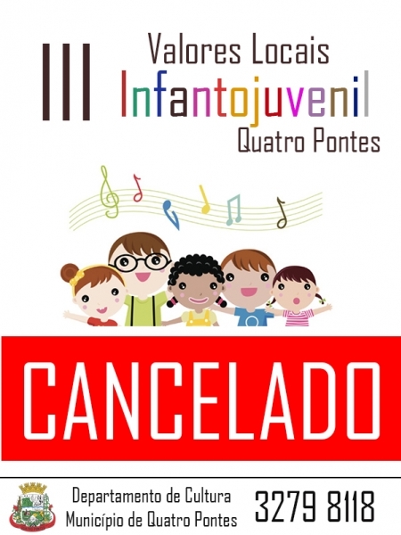 O Departamento de Cultura da Prefeitura Municipal de Quatro Pontes comunica que o III Valores Locais Infantojuvenil de Quatro Pontes previsto para acontecer nesta terça-feira (14) foi cancelado. Uma nova data será marcada e divulgada.