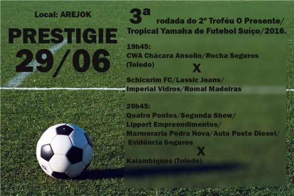 Na quarta-feira (29) o Município de Quatro Pontes vai receber dois jogos válidos pela 3ª rodada do º Troféu O Presente/Tropical Yamaha de Futebol Suíço/2016. Os jogos serão na Arejok. Confira: