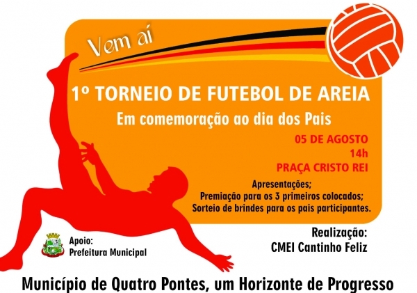 Em comemoração ao dia dos pais dia 05 de agosto de 2017 às 14 horas haverá o 1º torneio de futebol de areia na praça Cristo Rei do CMEI CANTINHO FELIZ.