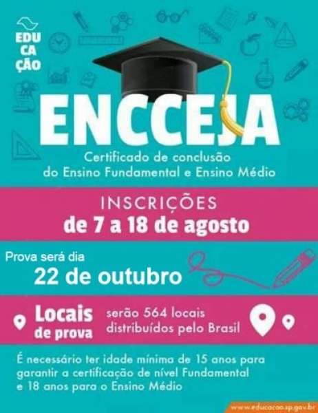 A prova será usada para alunos receberem o certificado de conclusão do ensino fundamental ou o médio. As inscrições vão até o dia 18 de agosto, e devem ser feitas somente pela internet, acessando esse link: (http://enccejanacional.inep.gov.br/#!/primeiroAcesso).