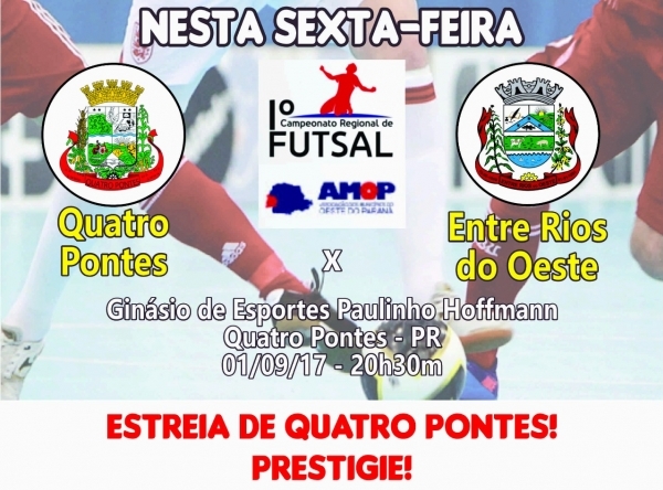 O município de Quatro Pontes irá receber amanhã a rodada do 1º Campeonato Regional de Futsal da AMOP. O time da casa irá enfrentar o selecionado de Entre Rios Do Oeste a partir das 20h30min no Ginásio de Esportes Paulinho Hoffmann.