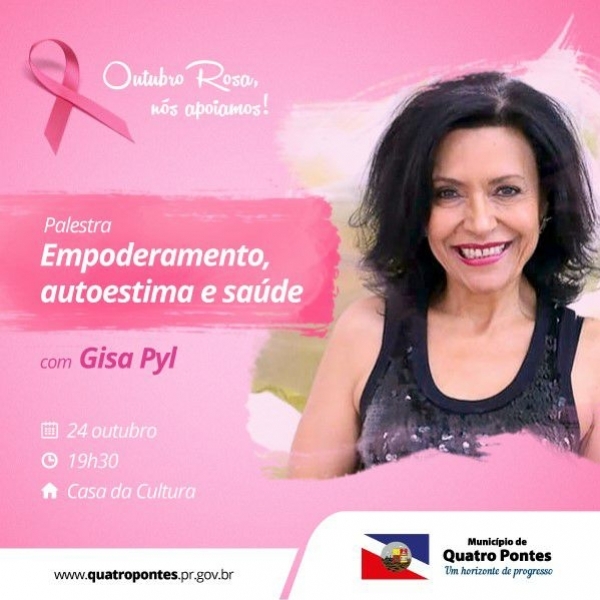 A Administração Pública de Quatro Pontes, em parceria com a Secretaria da Saúde Em prepara uma importante palestra referente ao outubro rosa e os cuidados com a saúde da mulher. A palestra é com a renomada palestrante Gisa Pyl e irá acontecer amanhã, terça-feira (24), as 19:30h na Casa da Cultura. O tema é: “Empoderamento, Autoestima e Saúde da Mulher”.