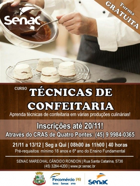 Atenção amantes da boa culinária. O município de Quatro Pontes, através do CRAS e Secretaria de Desenvolvimento Social irão oportunizar o Curso de Técnicas em Confeitaria. Inscrições poderão ser feitas até o dia 20 de novembro no CRAS do município, ou no telefone 9 99 84-03-65.