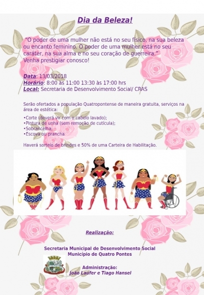 Amanhã (13), evento alusivo ao Dia da Mulher, celebrado no dia 08, será realizado pela Secretaria de Desenvolvimento Social de Quatro Pontes. Trata-se do Dia da Beleza, que acontecerá nas dependências da secretaria, tanto no período da manhã, das 08 às 11 horas, quanto na parte da tarde, das 13h30 às 17 horas.