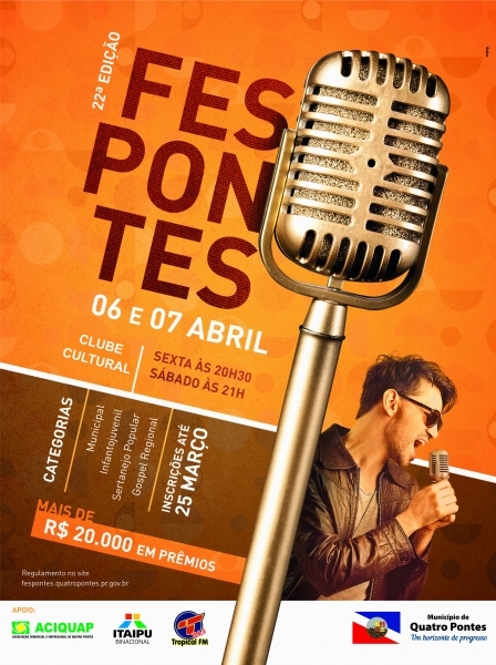 A Secretaria de Educação, Cultura e Esportes, por meio do Departamento de Cultura, acaba de anunciar os candidatos classificados para o 22º Fespontes, evento que integra a programação alusiva ao 26º aniversário de emancipação político-administrativa de Quatro Pontes. A eliminatória ocorreu por vídeo, sendo que totalizaram mais de 100 inscritos.