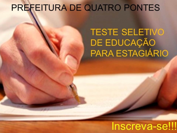 Na próxima quarta-feira (16), a Prefeitura de Quatro Pontes encerrará as inscrições para teste seletivo de cadastro reserva e preenchimento de vagas de estagiário para contrato temporário. A ficha de inscrição deve ser preenchida exclusivamente na prefeitura, via protocolo, no horário das 08 às 11h45 e das 13h30 às 17 horas.