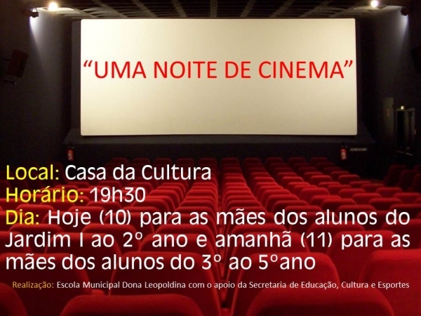Em alusão ao Dia das Mães, que será festejado neste domingo (13), evento especial será promovido hoje (10) e amanhã (11) para as mães de Quatro Pontes. Trata-se de “Uma noite de cinema”, que ocorrerá na Casa da Cultura. A iniciativa é da equipe pedagógica, professores e funcionários da Escola Municipal Dona Leopoldina, em parceria com a Secretaria de Educação, Cultura e Esportes.