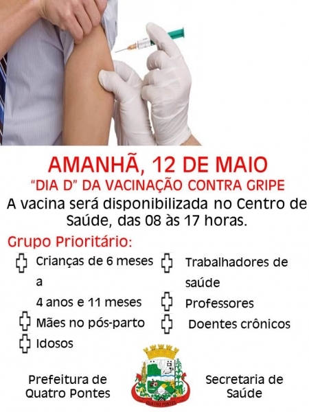 Amanhã (12), em Quatro Pontes, a Secretaria de Saúde realizará o “Dia D” da vacinação contra a gripe. A vacina, que é trivalente (o Influenza A, nas variações H1N1 e H3N2 e influenza B), será disponibilizada das 08 às 17 horas, sem intervalo para o almoço, no Centro de Saúde. Para recebê-la, é necessário apresentar o cartão de vacinação.