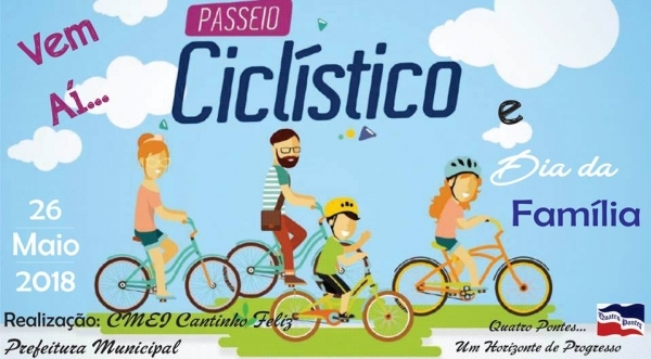 O Centro Municipal de Educação Infantil (Cmei) Cantinho Feliz de Quatro Pontes, com o apoio da Secretaria de Educação, Cultura e Esportes, realiza no sábado (26) o 2º Passeio Ciclístico e Dia da Família. O evento iniciará com concentração às 15 horas e a saída está marcada para às 15h30 em frente ao Cmei.