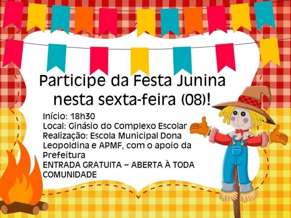 Na sexta-feira (08), a Escola Municipal Dona Leopoldina e a Associação de Pais, Mestres e Funcionários (APMF), com o apoio da Prefeitura de Quatro Pontes, promoverão a tradicional festa junina. Com entrada gratuita, o evento terá início às 18h30, tendo por local o Ginásio de Esportes do Complexo Escolar.