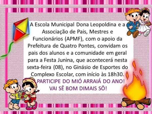 Tendo como palco o Ginásio de Esportes do Complexo Escolar, tradicional festa junina será realizada hoje (08) pela Escola Municipal Dona Leopoldina e a Associação de Pais, Mestres e Funcionários (APMF), com o apoio da Prefeitura de Quatro Pontes. A festa, que é gratuita e aberta à toda comunidade, terá início às 18h30. Além de apresentações juninas de todos os alunos, haverá venda de quitutes, pescaria e animação da dupla Zé Lucca e Gabriel.