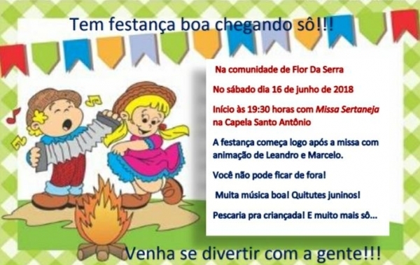 Está programada para sábado (16) a tradicional Festa Junina da comunidade da Linha Flor da Serra, interior de Quatro Pontes. O evento iniciará às 19h30, com missa sertaneja na Capela Santo Antônio. Após, a animação ficará por conta da dupla Leandro e Marcelo, incluindo venda de quitutes juninos, pescaria para as crianças, entre outras atrações.