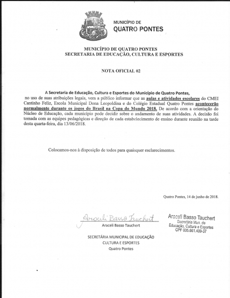 Em função da realização dos jogos da seleção brasileira de futebol na Copa do Mundo 2018, horário especial para atendimento ao público foi estabelecido nas repartições públicas municipais, conforme decreto assinado pelo prefeito de Quatro Pontes, João Laufer, e o secretário de Administração, vice-prefeito Tiago Hansel.