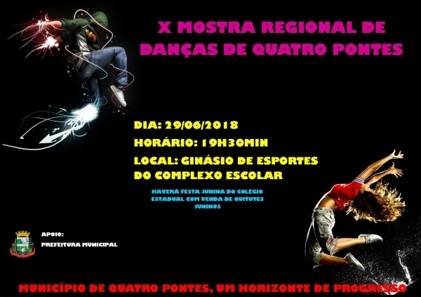 Tendo como palco o Ginásio de Esportes do Complexo Escolar, a Prefeitura de Quatro Pontes, por intermédio do Departamento de Cultura, realizará no próximo dia 29 a 10ª Mostra Regional de Danças. O evento tem entrada gratuita e está programado para iniciar às 19h30.