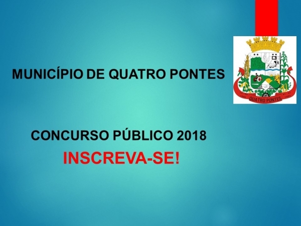 Serão encerradas na quinta-feira (26) as inscrições para concurso público e processo seletivo público da Prefeitura de Quatro Pontes, que devem ser feitas exclusivamente via internet, no site www.consesp.com.br. A taxa é de R$ 60 ou R$ 100, valor estipulado de acordo com o cargo pretendido.
