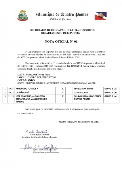 Em virtude do tempo chuvoso no sábado (1º), a primeira rodada do 19º Campeonato de Futebol Sete de Quatro Pontes foi adiada pelo Departamento de Esportes para amanhã (04). Os confrontos serão nas categorias amador e veterano e acontecerão no campo ao lado do Centro Poliesportivo Seno José Lang.