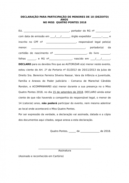 A Comissão Central Organizadora (CCO) do Miss Quatro Pontes 2018 alerta os menores de 14 anos que somente poderão participar do evento se acompanhados pelo pai, mãe ou responsável.