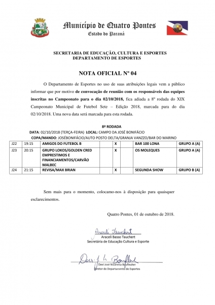 O Departamento de Esportes, no uso de suas atribuições legais, adiou a 8ª rodada do 19º Campeonato de Futebol Sete, categorias amador e veterano, com jogos marcados para hoje (02), no campo da Linha José Bonifácio, em Quatro Pontes. O motivo se deve à convocação de reunião com os responsáveis das equipes inscritas na competição, que acontecerá nesta terça-feira.