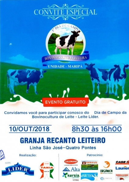 Tendo como palco a Granja Recanto Leiteiro, situada na Linha São José, 1º Dia de Campo da Bovinocultura Leiteira será realizado amanhã (10) em Quatro Pontes. A iniciativa é da Leite Líder, com o apoio da prefeitura, por intermédio da Secretaria de Desenvolvimento Econômico.