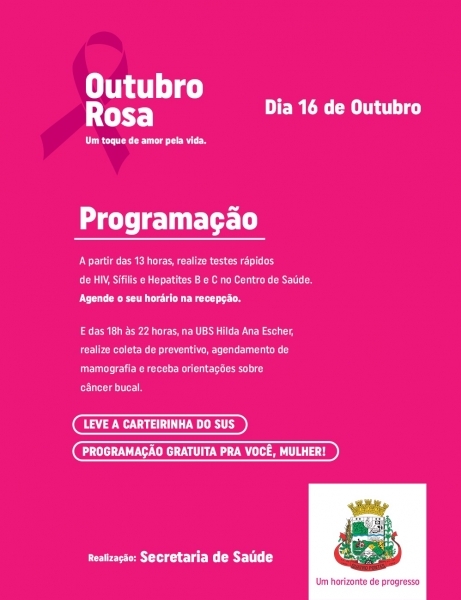 A enfermeira responsável pela UBS, Marli Soriani Socio, afirma que cada mulher deve cuidar da saúde. “É necessário se preocupar porque o câncer de mama e o de colo do útero não escolhe idade. Todas as mulheres estão sujeitas a isso. A melhor maneira é a prevenção através da coleta de preventivo e mamografias regulares. Convido o nosso público feminino para vir até a UBS e participar das ações. Também haverá brindes e muitas orientações. É o ‘Dia D’ do nosso trabalho de rotina, oportunizando um horário diferenciado”, assegura.
