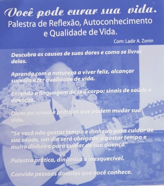 Conforme o profissional, a palestra é prática, dinâmica e inesquecível. “Descubra as causas de duas dores e como se livrar delas. Aprenda com a natureza a viver feliz, alcançar sucesso e ter qualidade de vida. Entenda a linguagem do seu corpo, como sinais de saúde e doenças. Darei dicas possíveis e práticas que podem mudar sua vida. Saiba como enfrentar os desafios do mundo moderno, a influência do emocional sobre o nosso físico, os efeitos e benefícios da tecnologia, mediante a radiação que estamos sofrendo todos os dias. Convide toda a família para participar”, esclarece.