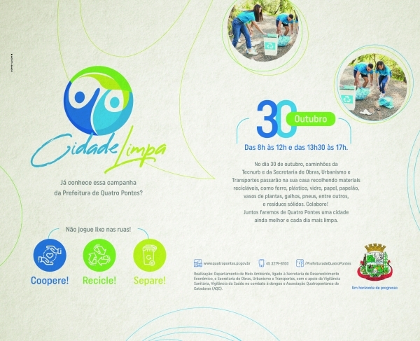 Intitulada “Cidade Limpa”, campanha para conservar o município limpo, contribuindo com o meio ambiente, será realizada amanhã (30), em Quatro Pontes. A iniciativa é do Departamento de Meio Ambiente, ligado à Secretaria de Desenvolvimento Econômico, e da Secretaria de Obras, Urbanismo e Transportes, mediante o apoio da Vigilância Sanitária, Vigilância da Saúde no combate à dengue e da Associação Quatropontense de Catadores (AQC), e acontecerá das 08 ao meio-dia e das 13h30 às 17 horas.