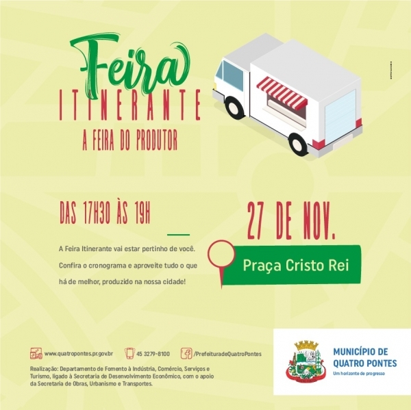 Nesta terça-feira (27), das 17h30 às 19 horas, o caminhão feira itinerante estará com atendimento na Praça Cristo Rei, ao lado da Prefeitura de Quatro Pontes. Às pessoas do município e cidades vizinhas são ofertados diversos produtos coloniais, como pão, doces, bolo, morcilia, cucas, bolachas, verduras, torresmo, salame e outros, incluindo peixes. Tudo é produzido por cinco produtores que já participam da Feira do Produtor às sextas-feiras, junto ao Centro de Eventos Seno José Lang.