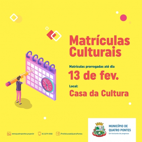 Os Departamentos de Cultura e Esportes de Quatro Pontes prorrogaram até a próxima quarta-feira (13) as matrículas para as oficinas, projetos e treinamentos ofertados de graça para crianças até idosos, em Quatro Pontes. As matrículas culturais devem ser realizadas junto à Casa da Cultura, com Denise, e as esportivas no Departamento de Esportes, com Marlene, sendo que os professores também estão auxiliando.