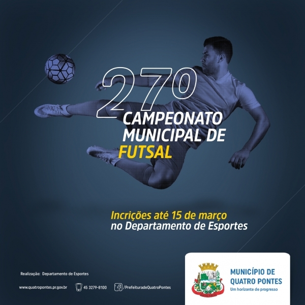 Na sua 27ª edição, o Campeonato Municipal de Futsal, categorias amador e veterano masculino, está com as inscrições abertas em Quatro Pontes. Eles seguem até o dia 15 de março e devem ser realizadas com Marlene ou Alex no Departamento de Esportes, organizador da competição, ou pelos telefones 99984-0436 e 98831-8107. A taxa de inscrição é de R$ 200 por equipe, valor que será revertido em premiação.