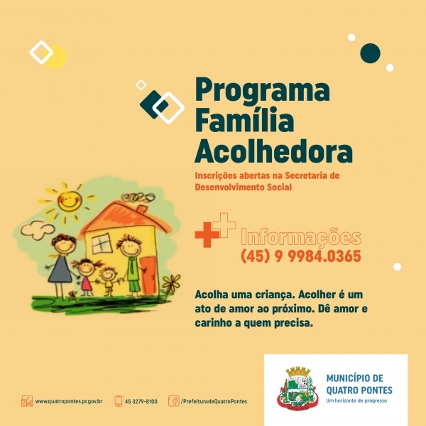 “Interessados em participar do programa devem se inscrever na secretaria, seguindo alguns critérios. Ou seja, a família ou pessoa física, sem discriminação de sexo, etnia e estado civil, que quer ter sob a sua guarda e responsabilidade crianças e adolescentes, zelando pelo seu bem-estar, de acordo com a legislação vigente, deve ter 21 anos ou mais, residir em Quatro Pontes há, pelo menos, dois anos, não possuir antecedentes criminais, não apresentar problemas psiquiátricos e/ou dependência de substâncias psicoativas, demonstrar disponibilidade de tempo e interesse em oferecer proteção e amor e não estar inscrita no cadastro de adoção do Juízo da Infância e Juventude”, explica a secretária.