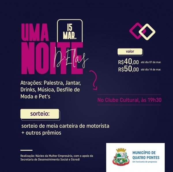 A fim de celebrar o Dia da Mulher, comemorado em 08 de março, evento alusivo será promovido pelo Núcleo da Mulher Empresária de Quatro Pontes, mediante o apoio da Secretaria de Desenvolvimento Social e Sicredi. O “Uma Noite D’elas” acontecerá no próximo dia 15, a partir das 19h30, no Clube Cultural.