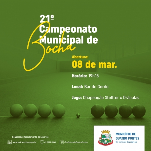 Na 21ª edição, o Campeonato Municipal de Bocha de Quatro Pontes, organizado pelo Departamento de Esportes, tem a sua abertura marcada para amanhã (08), no Bar do Gordo. O primeiro jogo será entre Chapeação Steltter e Dráculas, às 19h15.