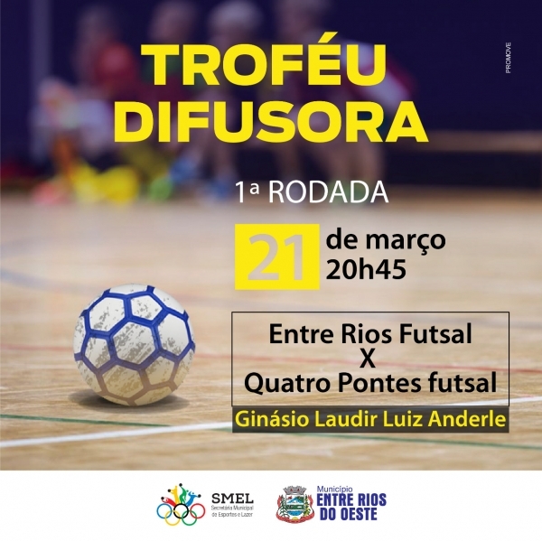 Hoje (21), a partir das 20h45, Quatro Pontes Futsal fará sua estreia na primeira rodada do 43º Troféu Difusora/Sicoob de Futsal. A partida será contra o selecionado de Entre Rios Futsal/A. Rambo/Cerâmica Stein/LC Net Telecom/Farma Útil/Advocacia Sidnei Bortolini/Agroceres Multimix, no Ginásio de Esportes Laudir Luiz Anderle, em Entre Rios do Oeste.