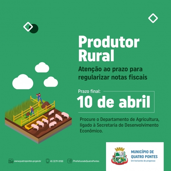 A Secretaria de Desenvolvimento Econômico de Quatro Pontes, por intermédio do Departamento de Agricultura, fará o processo de regularização do bloco de produtor rural com notas vencidas em 28 de fevereiro e anteriores somente até o próximo dia 10.