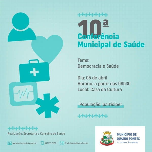 Está programada para amanhã (05) a 10ª Conferência Municipal de Saúde, organizada pela Secretaria de Saúde e o Conselho Municipal de Saúde de Quatro Pontes, na Casa da Cultura. Com o tema “Democracia e saúde”, o evento iniciará a partir das 08h30, seguindo até às 09h30 com credenciamento dos (as) delegados (as) e as inscrições de observadores, bem como de convidados, incluindo café da manhã. Às 09h30 ocorrerá à abertura oficial e às 10 horas serão promovidas apresentações culturais.
