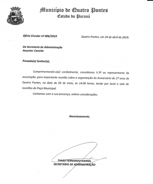 A Prefeitura de Quatro Pontes, através da Secretaria de Administração, realizará às 14 horas de sexta-feira (03) reunião para organização dos festejos alusivos aos 27 anos de emancipação político-administrativa do município, junto à sala de reuniões do paço municipal. Para tal foram convidados presidentes e/ou representantes de associações, clube de mães e de damas. A pauta será colocada em discussão pela Comissão Central Organizadora (CCO).