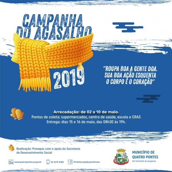 Intitulada “Roupa boa a gente doa. Sua boa ação esquenta o corpo e o coração”, Campanha do Agasalho 2019 foi lançada hoje (02) em Quatro Pontes. De iniciativa do Provopar, com o apoio da Secretaria de Desenvolvimento Social, a coleta de agasalhos, cobertores, roupas e calçados será realizada até o próximo dia 10.