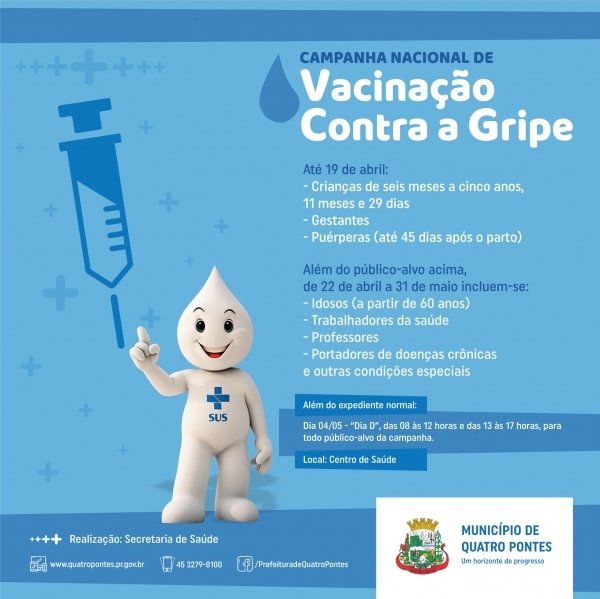 Como em todo país, a Secretaria de Saúde de Quatro Pontes realizou no sábado (04) o dia “D” da Campanha Nacional de Vacinação contra a Influenza (Influenza H1N1, H3N2 e Influenza B), com a tarefa de imunizar os grupos prioritários.