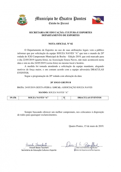 O Departamento de Esportes de Quatro Pontes informa que por solicitação da equipe Souza Naves “A”, que tem o mando da 20ª rodada do 21º Campeonato Municipal de Bocha 2019, marcada para acontecer nesta quarta-feira (22), não mais acontecerá na referida data, mas na sexta-feira (24), no mesmo local e horário, às 19h15, na sede da Linha Souza Naves.