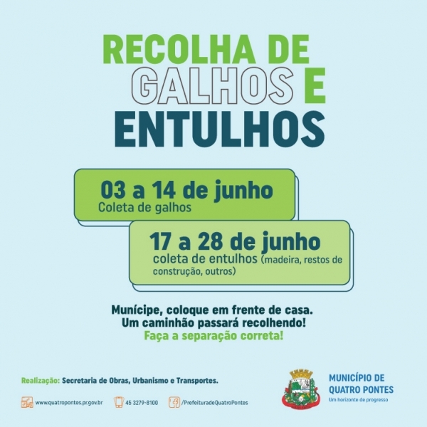 Permanente em Quatro Pontes, novo cronograma da campanha de recolha de galhos e entulhos foi iniciado ontem (03) pela Secretaria de Obras, Urbanismo e Transportes na sede do município. Assim, até o dia 14 será feita a coleta de galhos. Já entre os dias 17 e 28 ocorrerá a recolha de entulhos (madeira, restos de construção e outros).
