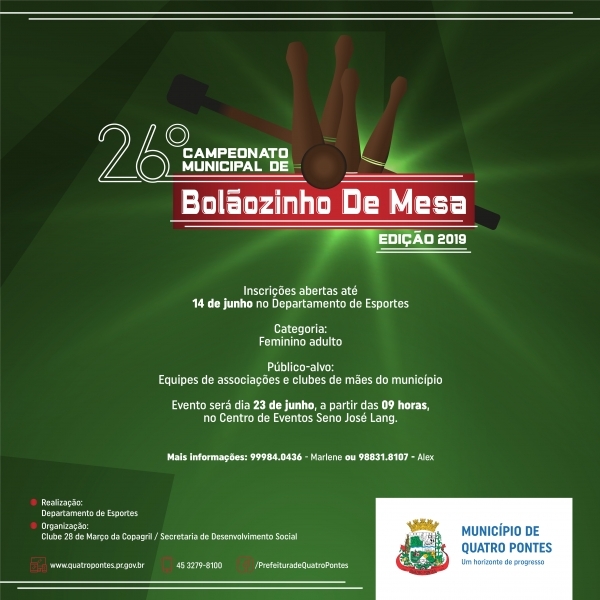 Terminam hoje (14) as inscrições para o 26º Campeonato Municipal de Bolãozinho de Mesa de Quatro Pontes - edição 2019. Elas devem ser feitas no Departamento de Esportes ou por meio dos telefones 99984-0436 (Marlene) e 98831-8107 (Alex). A taxa é R$ 20 por equipe, que deve ter no mínimo quatro atletas e no máximo cinco. A categoria é feminino adulto e apenas equipes de associações e clubes de mães do município podem participar.