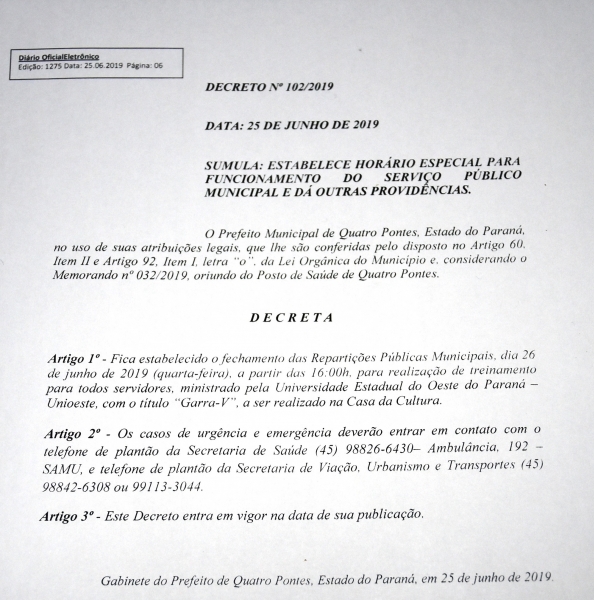 A Prefeitura de Quatro Pontes estabeleceu horário especial para o funcionamento do serviço público municipal hoje (26). O prefeito João Laufer, no uso de suas atribuições legais e considerando o memorando nº 032/2019 do Centro de Saúde, decretou o fechamento das repartições públicas a partir das 16 horas desta quarta-feira para a realização do treinamento “Garra-V”, que será ministrado pela Universidade Estadual do Oeste do Paraná (Unioeste) para todos os servidores, na Casa da Cultura.
