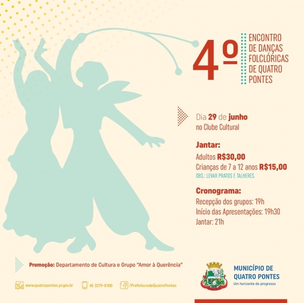 Organizado pelo Departamento de Cultura e o grupo gauchesco “Amor à Querência”, o 4º Encontro de Danças Folclóricas de Quatro Pontes acontecerá amanhã (29) no Clube Cultural. Para às 19 horas está marcada a recepção dos grupos, às 19h30 terão início às apresentações e às 21 horas será servido o jantar, devendo reunir em torno de 300 pessoas.